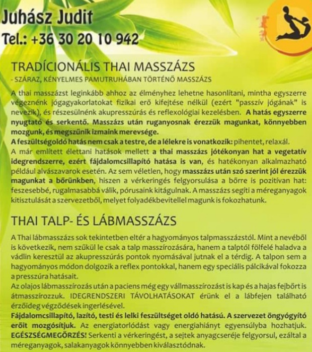 A thai masszázs elsősorban egészségmegőrzésre- és megelőzésre szolgál, jótékonyan hat minden korosztálynak figyelembe véve az életkori és egészségi adottságokat.